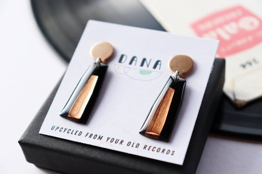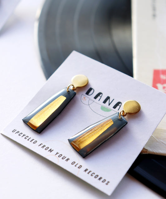 Elegant upcycled black vinyl record earrings with a subtle hint of silvery grey label / ONE OF A KIND