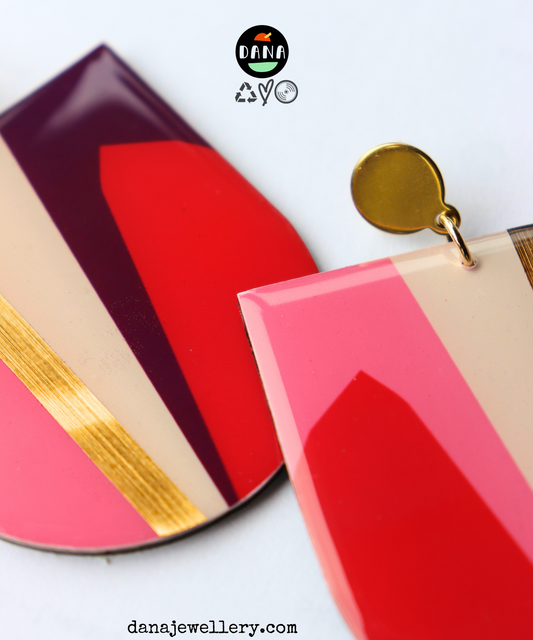 NIKKI NO.1 in red, pink, plum, gold / abstract contemporary recycled earrings