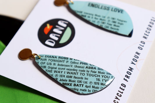 WILL YOU LOVE ME / 1982 / Endless Love compilation / upcycled arch vinyl record earrings in aqua and black / ONE OF A KIND