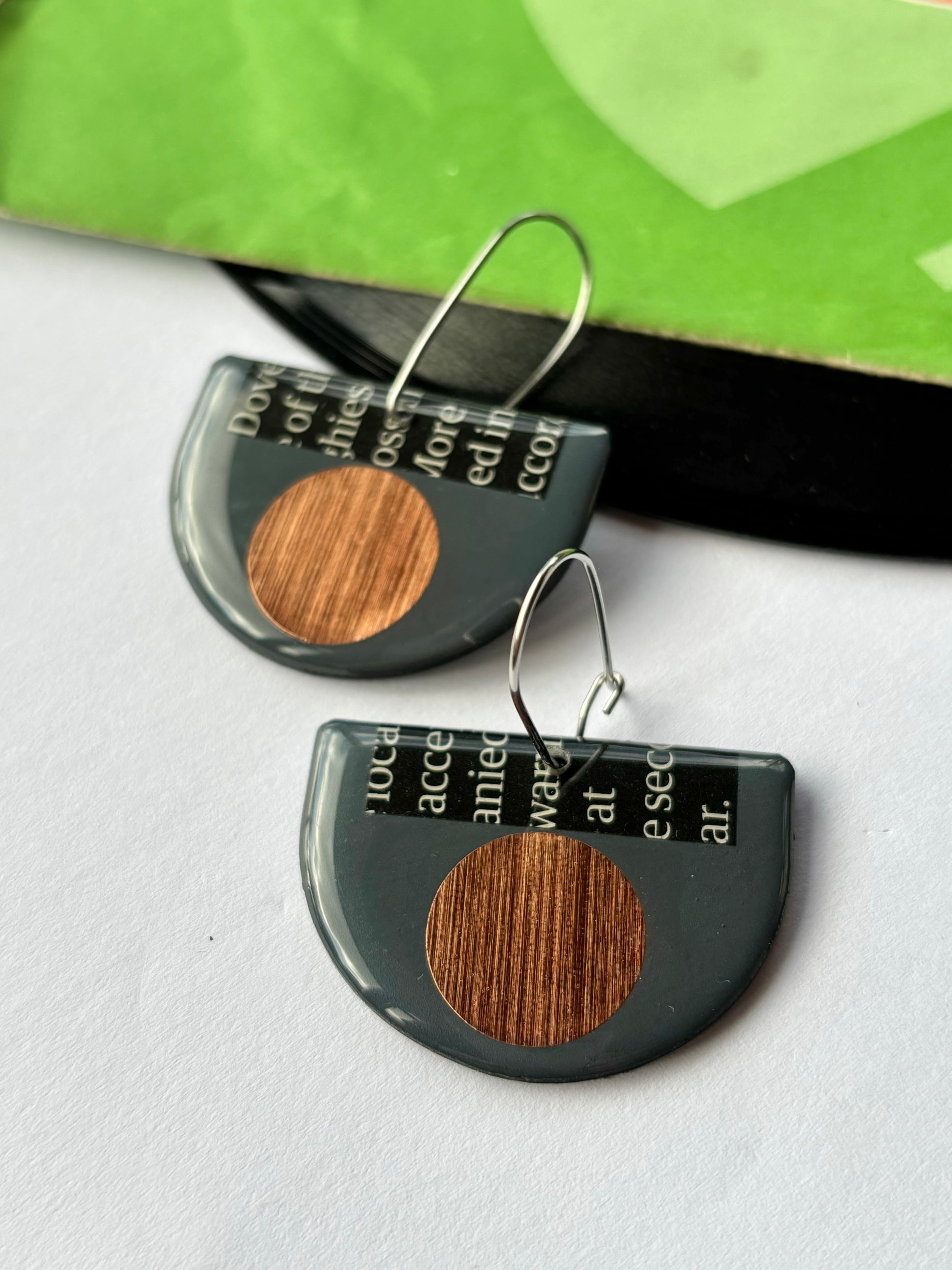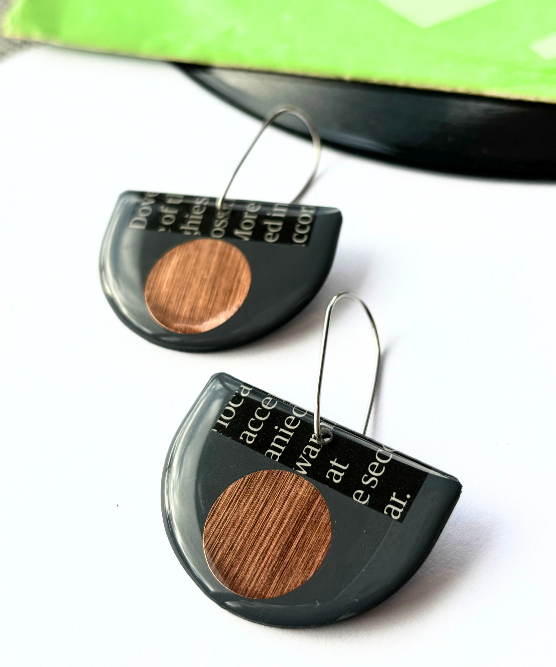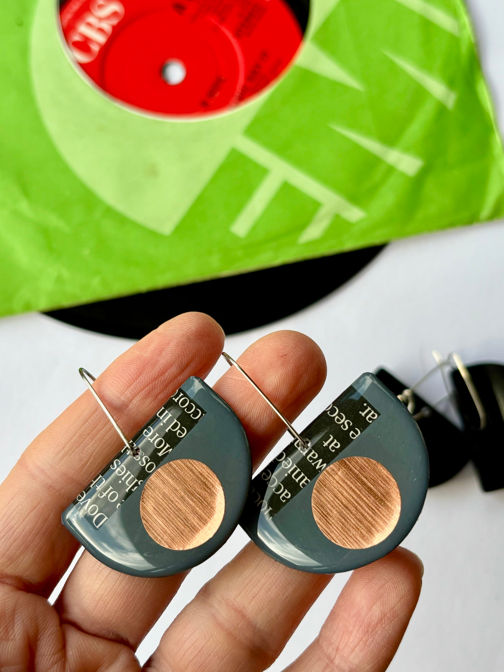 40% OFF /read description/ repurposed vinyl earrings in deep blue grey and copper with a hint of magazine paper