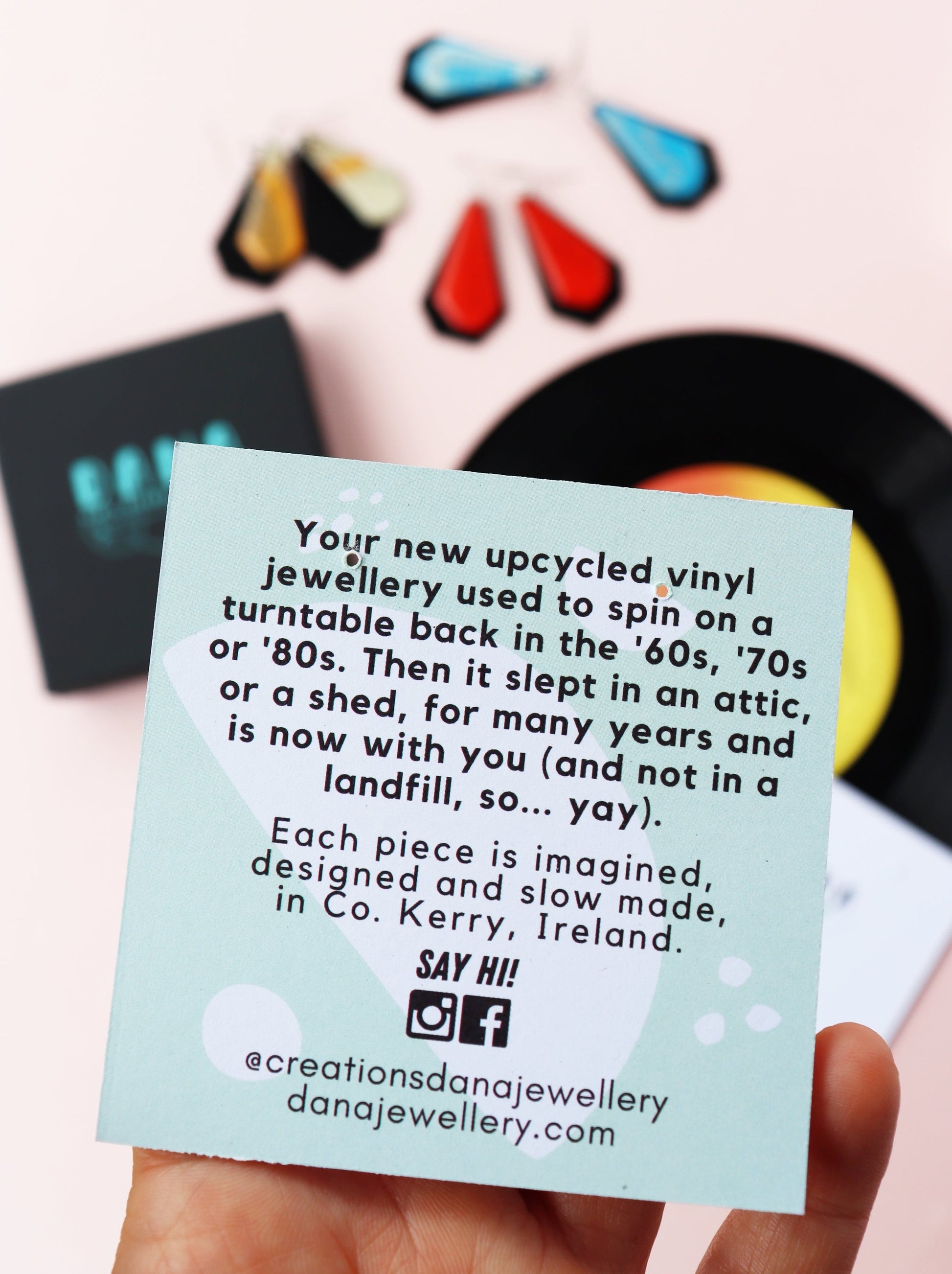 These upcycled yet tres chic of a kind vinyl record earrings combine a touch of lush copper to deep blue grey, with recycled magazine paper detail, using the analog collage technique. Literally groovy, you can admire the original record in all its groovy glory at the back of the earrings. They are a great present for vinyl lovers, sustainable fashion enthusiasts or anyone on the lookout for that bold unique handmade accessory.