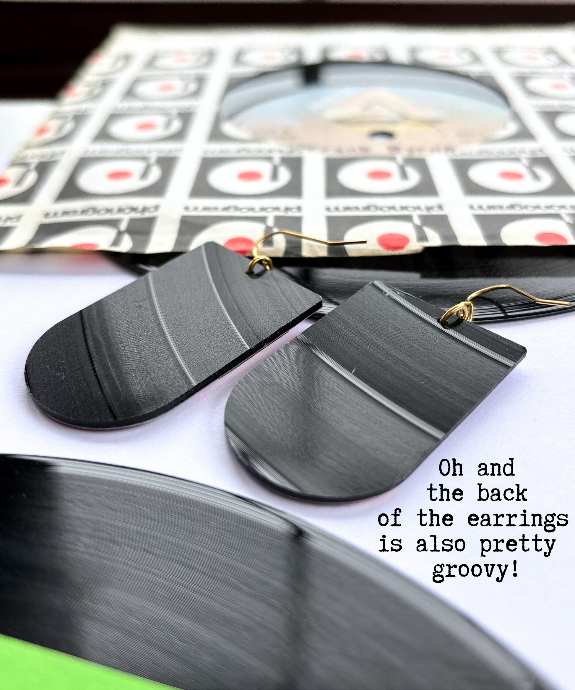 ▹admire the original vinyl record in all its groovy glory at the back of the earrings