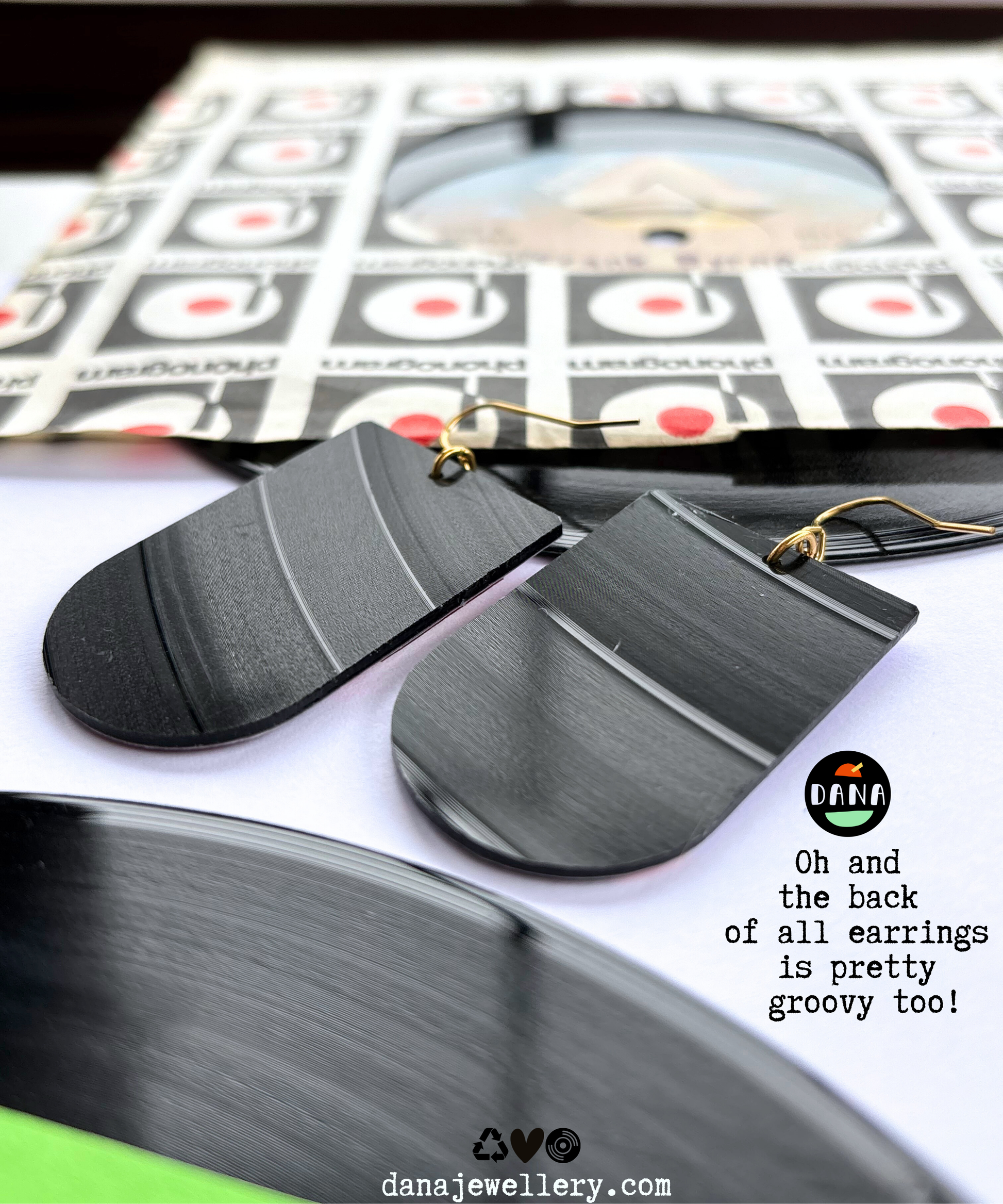 DANA jewellery designs are made using unwanted and beat up vinyl records, saved from ending up in landfill, that once played music for someone, somewhere, back in the day. Each pair carries its own story etched into the grooves of the record and a new chapter is about to begin with you. Yup, rubbish has never looked better.