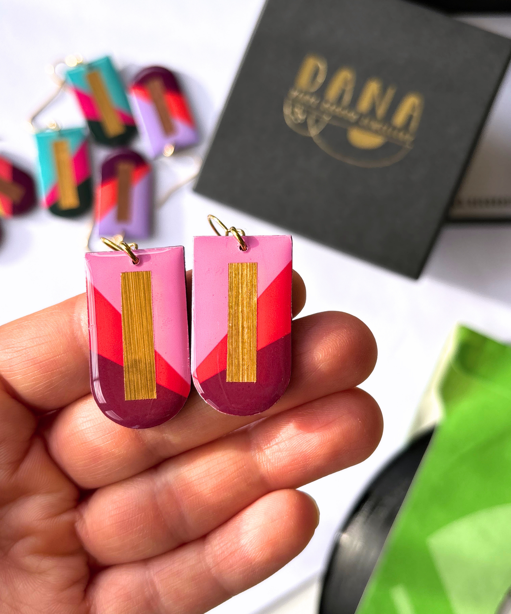 The NINA recycled record earrings in pink, red, burgundy, and gold are defined by clean lines and solid shapes for an elegant -yet fun- style. The mid-century modern aesthetic is only reinforced by the bold gold geometric accents that really make the earrings come to life as they dangle in the light. To make these extra special, the backs of these feature the original unaltered vinyl record in all its groovy glory (see 5th photo).