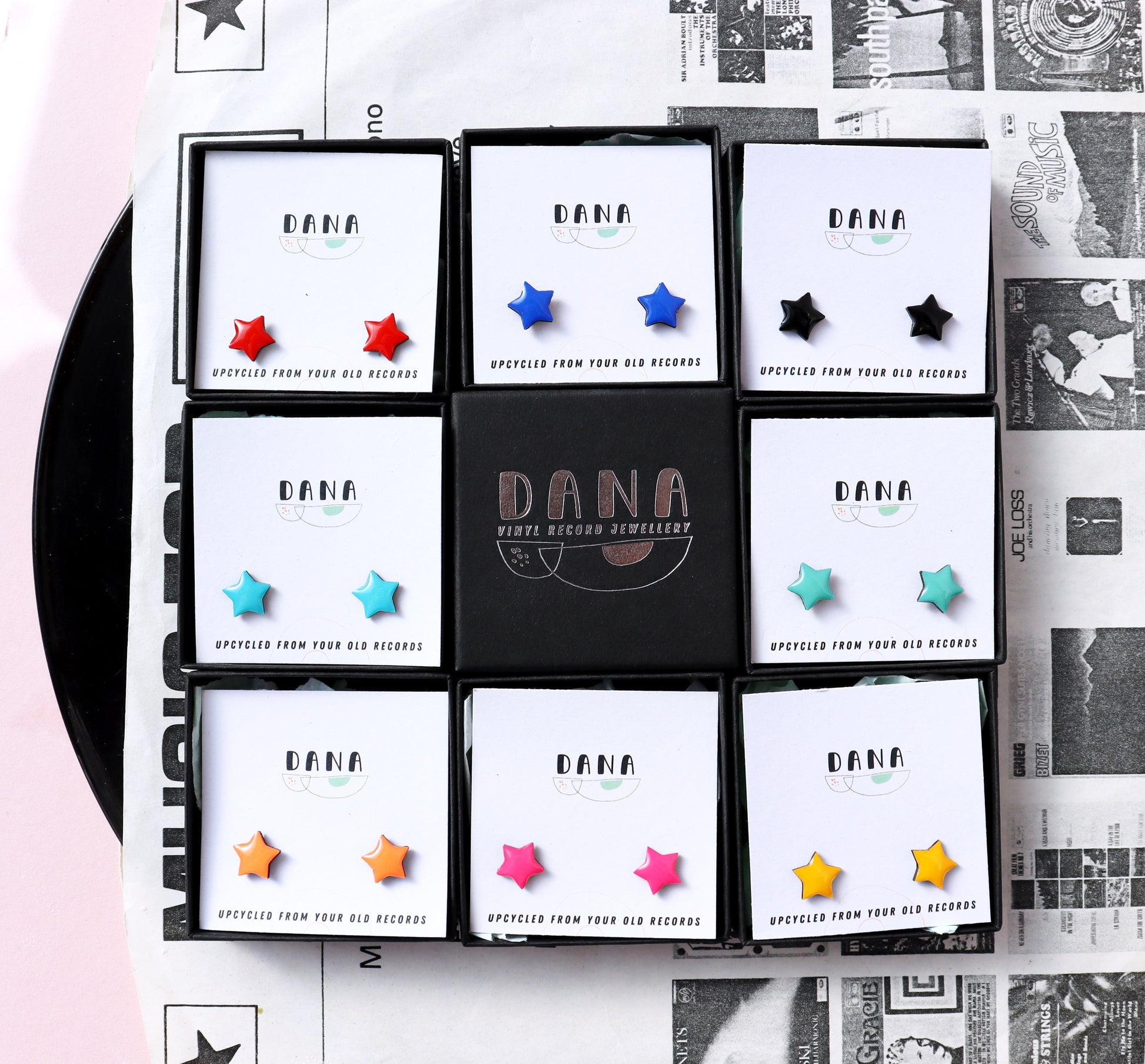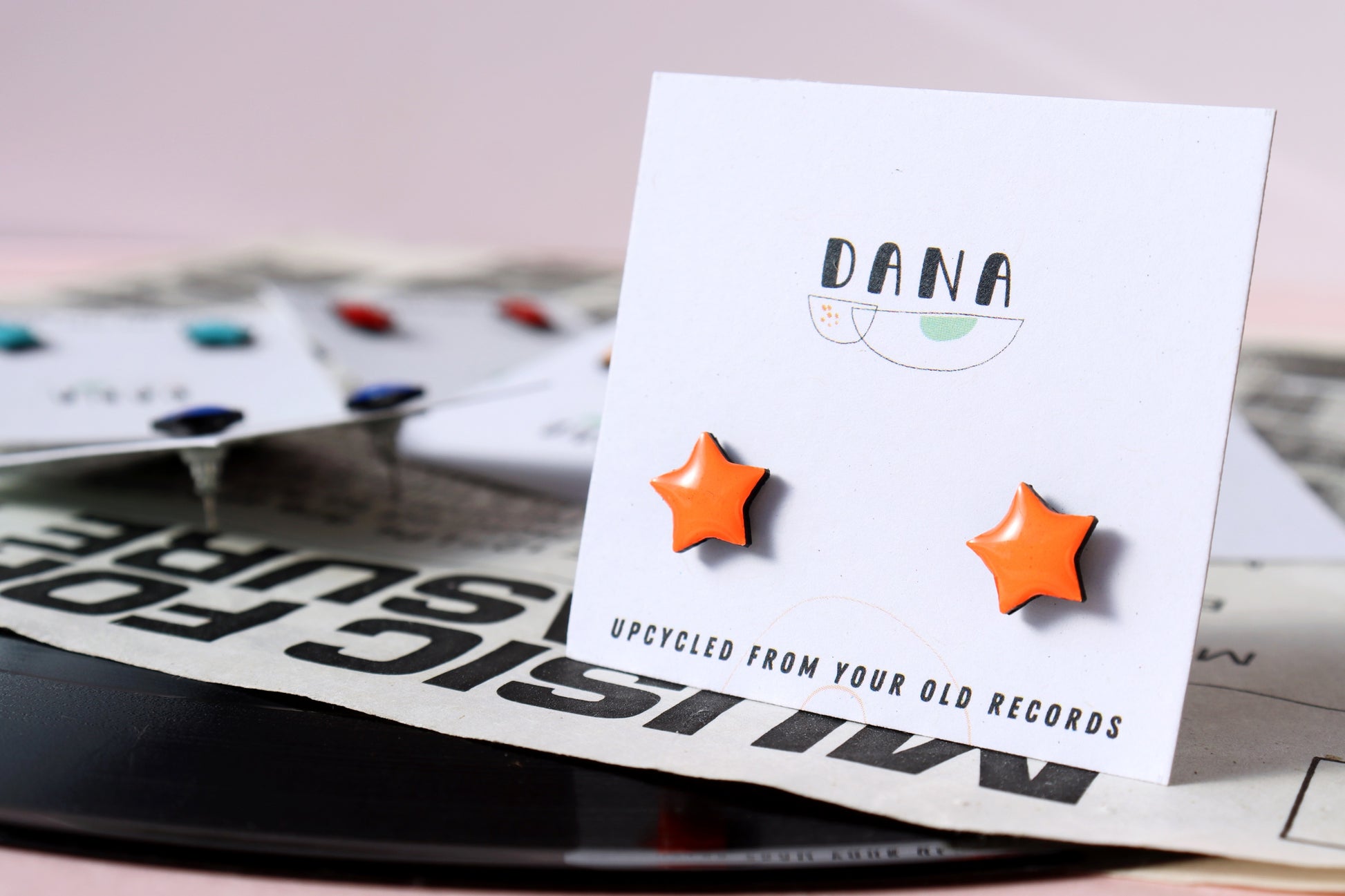 These cute upcycled vinyl record star studs are made from an old vinyl record that was headed for landfill and are available in 8 colours. They are a great present for vinyl lovers, sustainable fashion enthusiasts or anyone on the lookout for that bold unique handmade accessory.