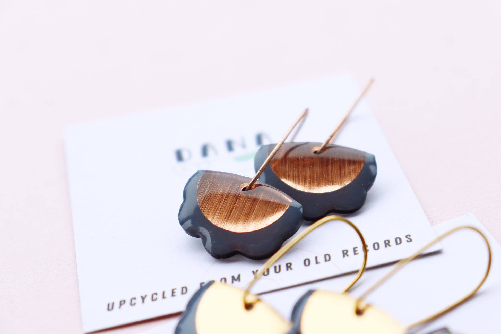 Minimal with a subtle touch of metallic shine, the dainty Froufrou earrings are upcycled from a vinyl record that was saved from going to landfill. Oh you will love how the light dances over the metallic details. A great present for vinyl lovers, sustainable fashion enthusiasts or anyone on the lookout for that bold unique jewellery design.