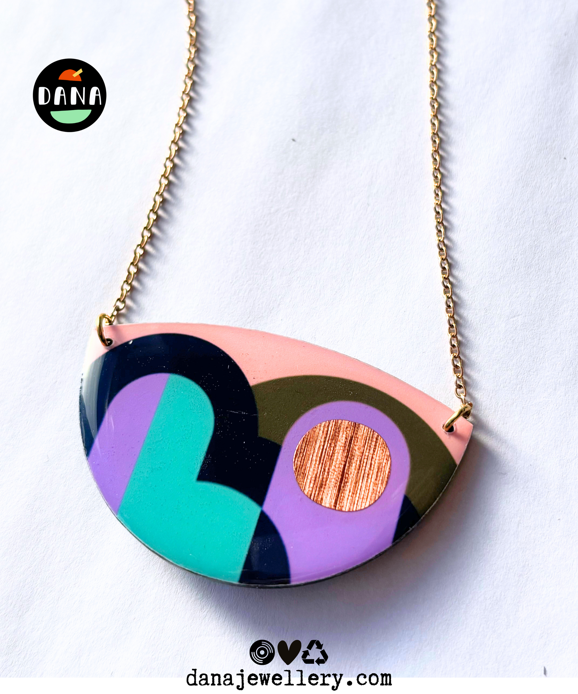 Handmade in Ireland from a recycled vinyl record, the LOLA no.1 necklace features a contemporary graphic abstract composition in olive, navy, lilac and turquoise, accented with a warm metallic pop of copper. Matching earrings coming soon.