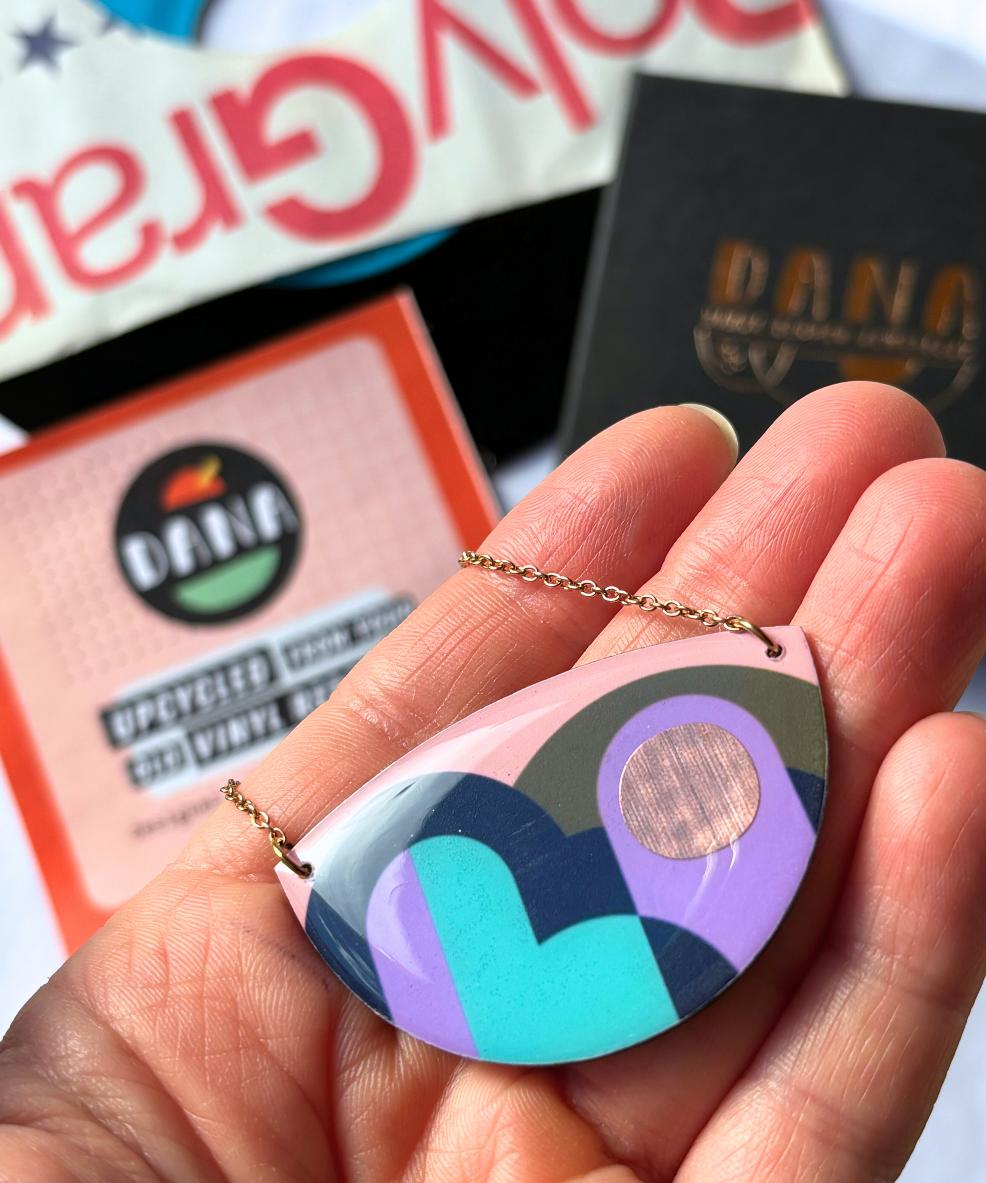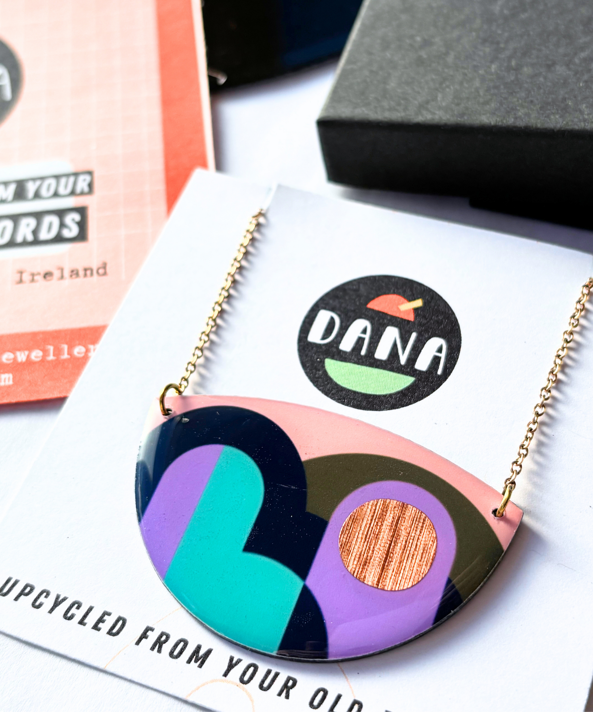 DANA jewellery original designs are made in Ireland using unwanted and beat up vinyl records, saved from ending up in landfill, that once played music for someone, somewhere, back in the day. Each design carries its own story etched into the grooves of the record and a new chapter is about to begin with you. Yup, rubbish has never looked better.