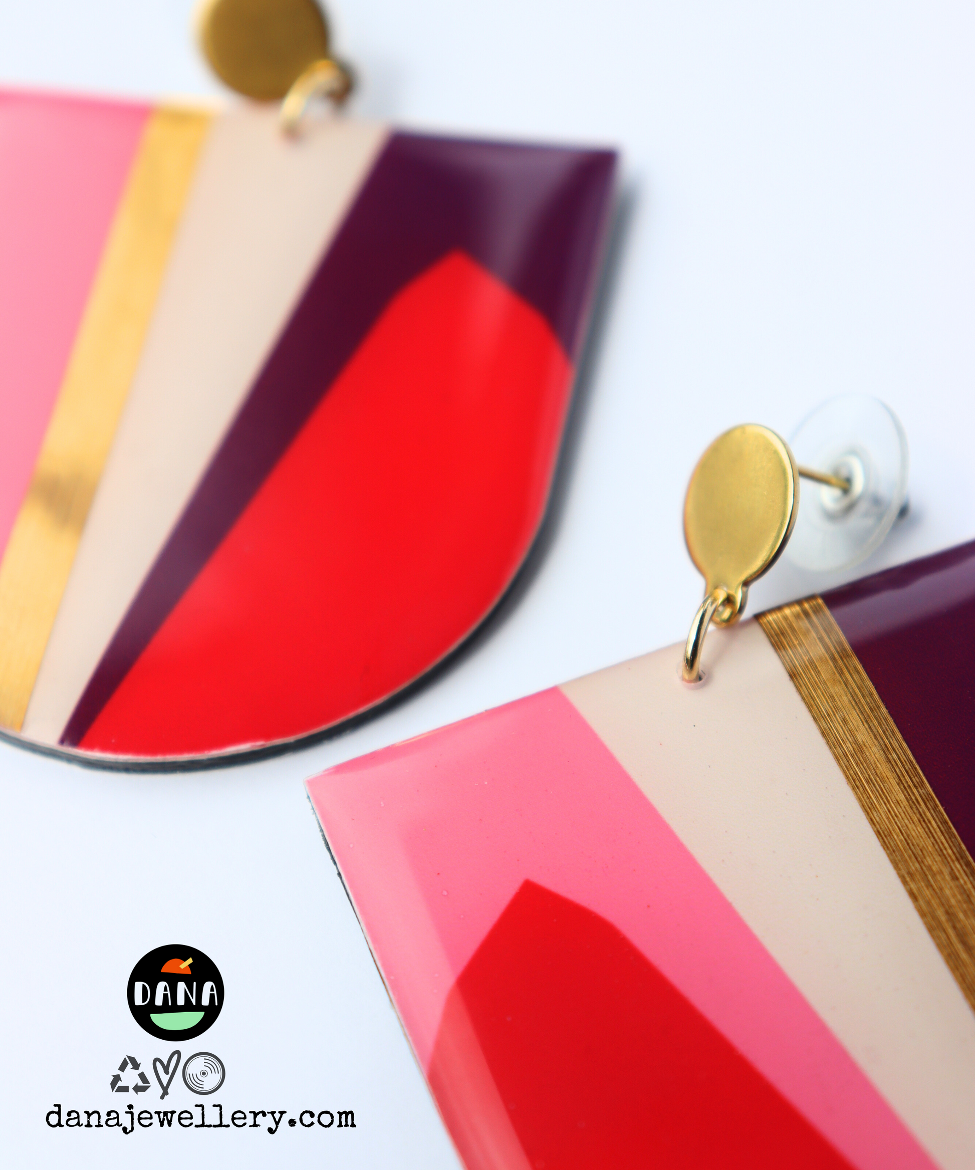 NIKKI NO.1 in red, pink, plum, gold / abstract contemporary recycled earrings