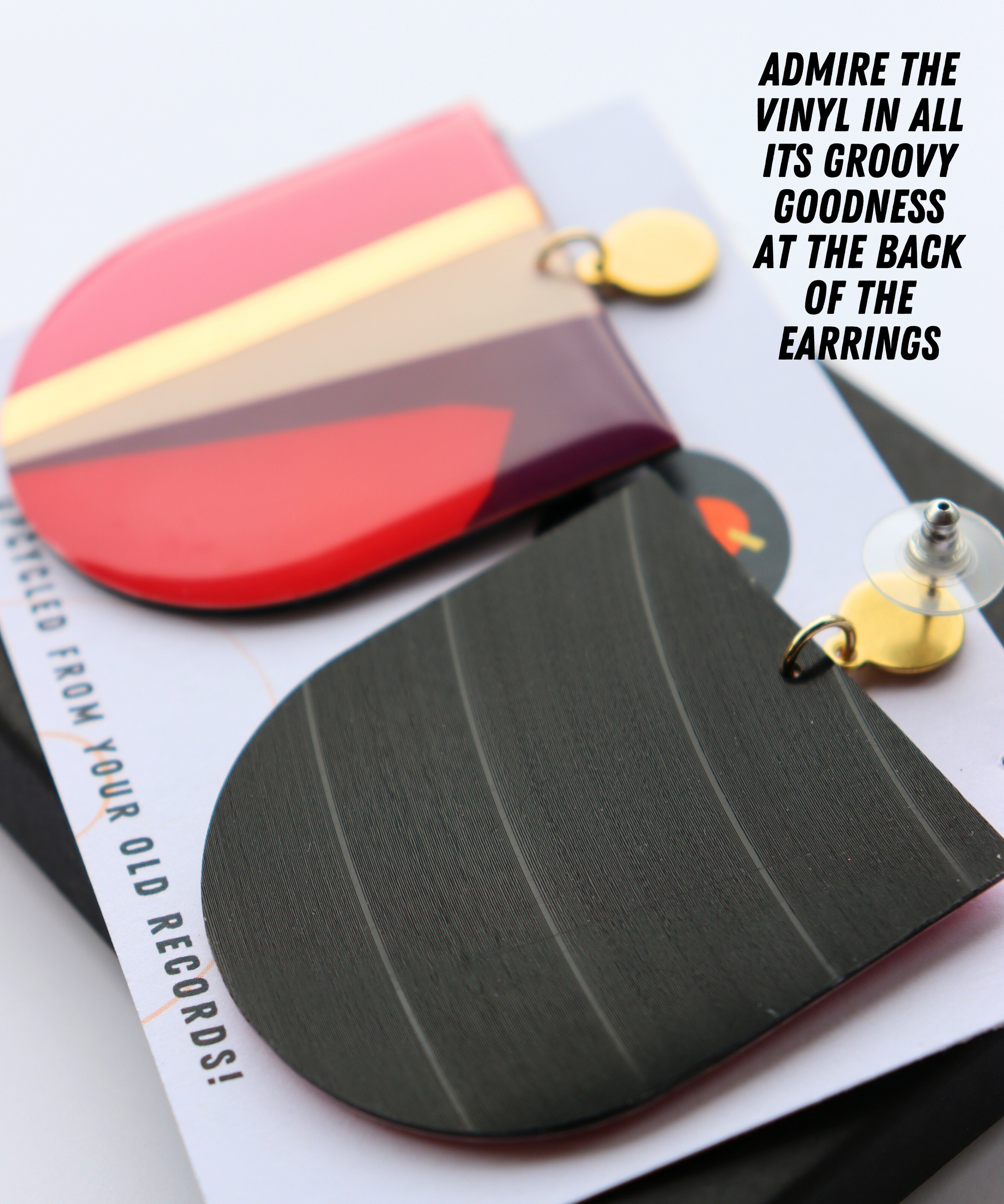 ▹admire the original vinyl record in all its groovy glory at the back of the earrings