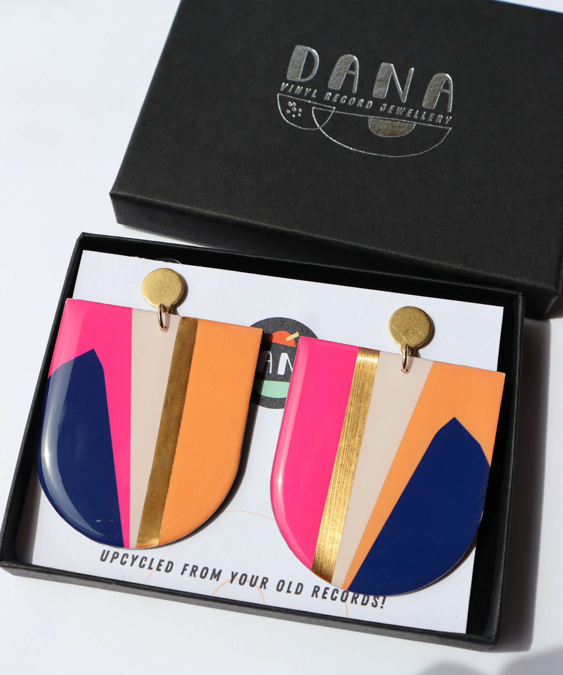 DANA jewellery designs are made using unwanted and beat up vinyl records saved from ending up in landfill. Rubbish has never looked better.