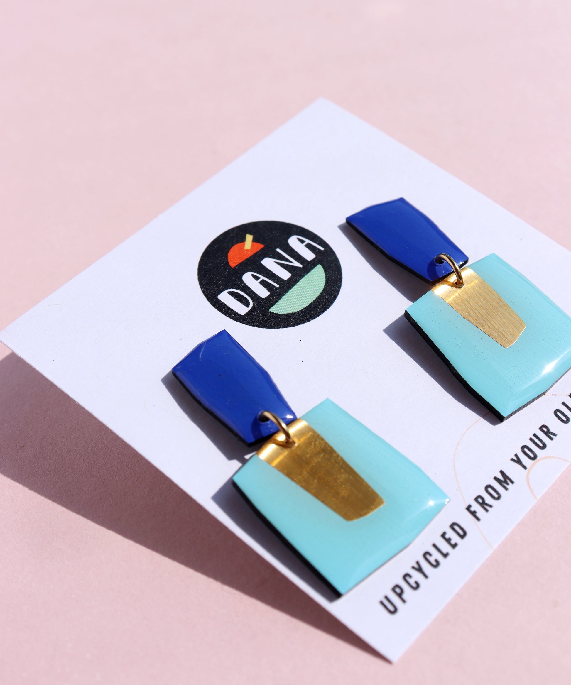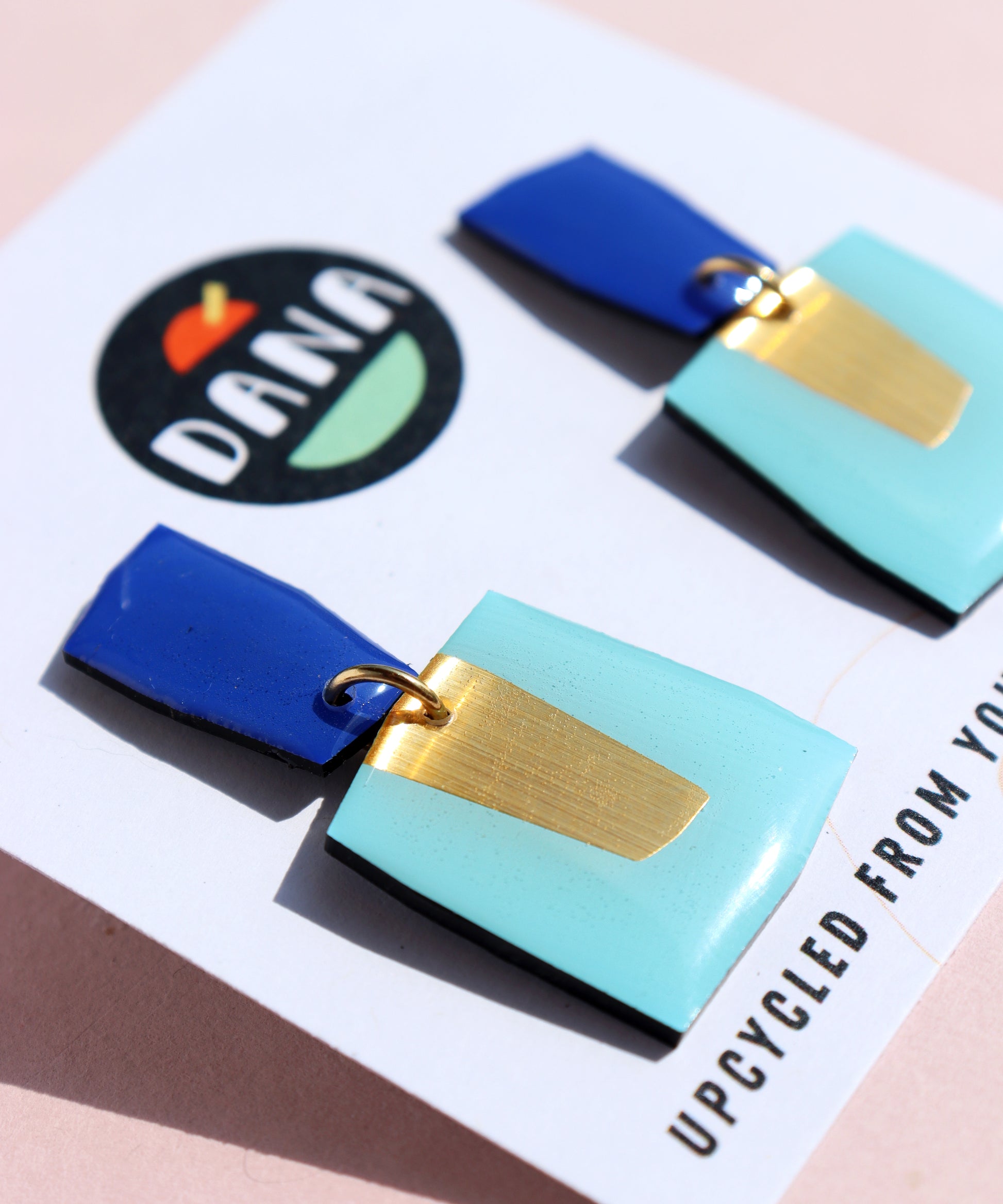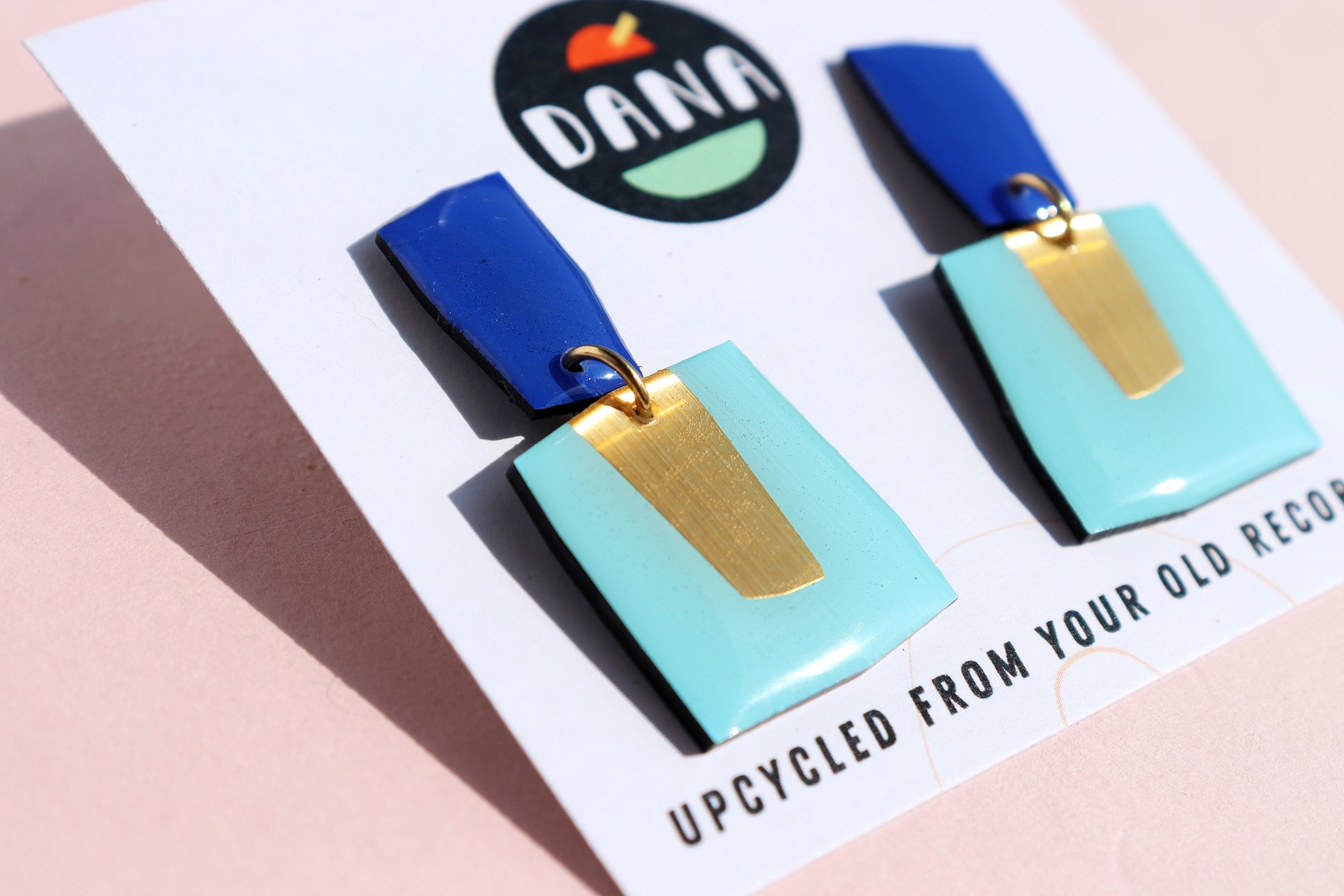 The PATSY no.1 in blue & gold are bold yet très chic, with strong geometric lines combined to that metallic pop that gives these their personality. This design is a fab present for the vinyl enthusiast in your life or the lover of quirky and unique art jewellery or upcycled design. All pieces are slow made in my little home studio in Co. Kerry, from vinyl records saved from ending up in landfill. Yup, rubbish has never looked better.